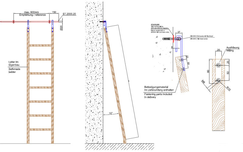 Der Einhängehaken ist für den Einsatz mit unseren Laufschienen mit Durchmesser 20mm (Zubehör) und einen Anstellwinkel von 10° konstruiert.