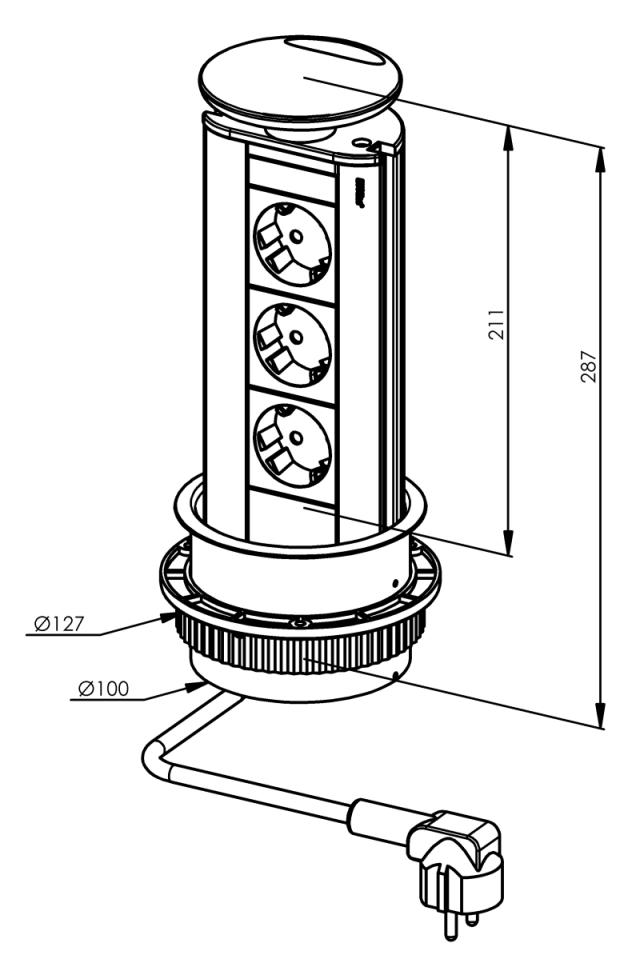 Einbau-Schutzkontakt-Steckdosenleiste 3-fach 16 Ampere mit Berührungsschutz, versenkbar.
