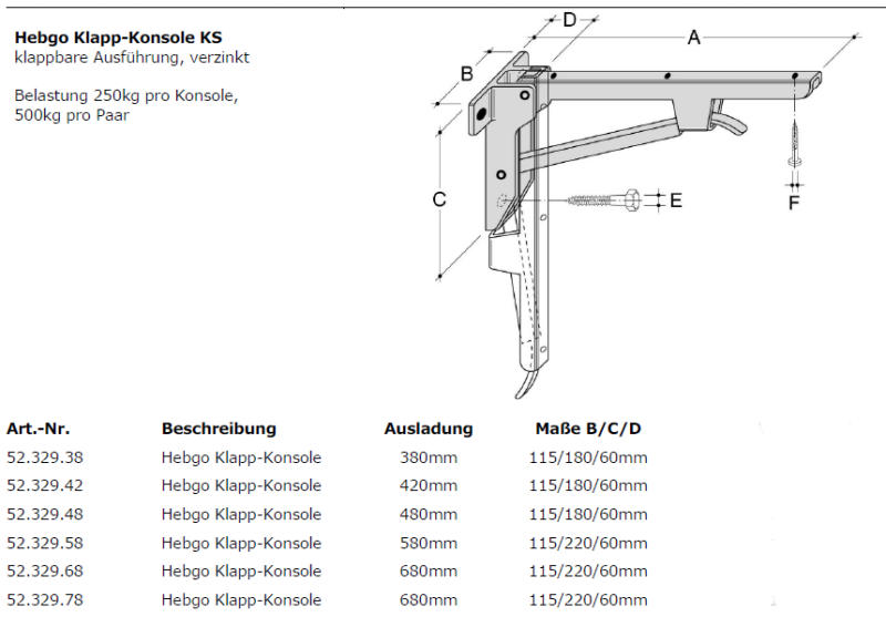 Hegbo Klapp-Konsole KS verzinkt, Belastung je Konsole 250kg / 500kg je Paar.