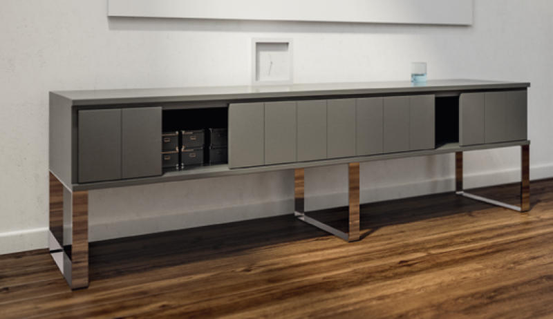 Kufensystem für Sideboard, Profil 60x8mm in Edelstahl matt gebürstet oder Stahl verchromt poliert.