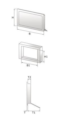 Außenmaße: BxH 224x7x159mm / 285x7x155mm, Ausschnittmaße 207x142mm / 285x155mm. Maße T1/T2 = 115x18mm / 115x18mm.