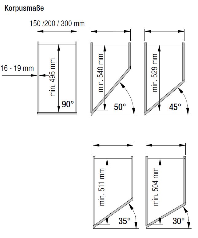 Unterschrank Seitenauszug DSA in 4 verschiedenen Einbauhöhen ohne Körbe.