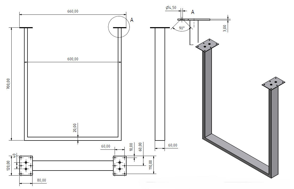 Ausführung Edelstahlrohr 60x20mm matt geschliffen. Höhe 700mm, Tiefe 600mm, Tiefe (Außennmaß inkl. Befestigungsplatten) 660mm.